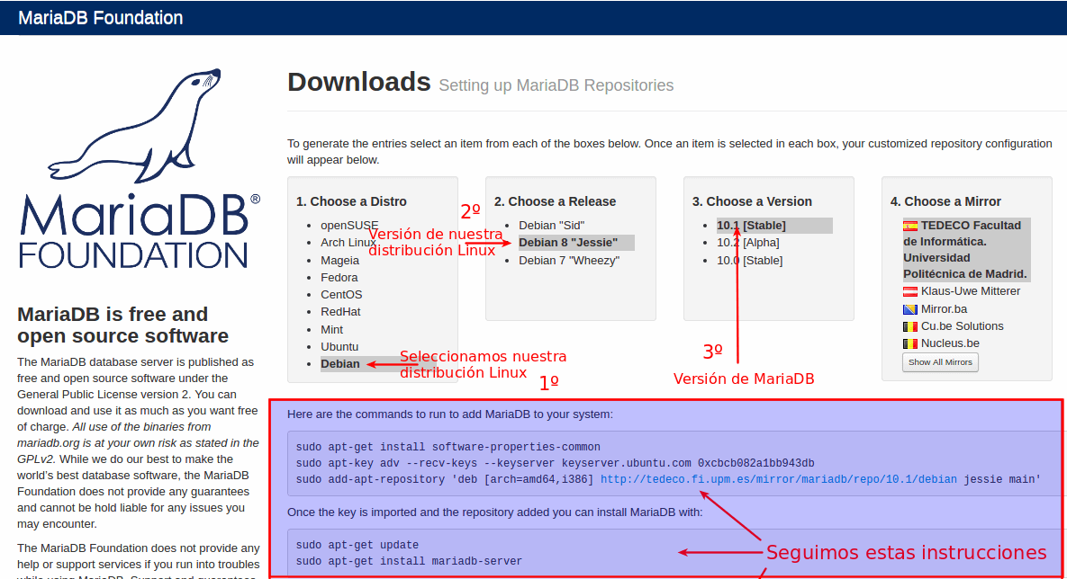 Siguiendo las instrucciones detalladas en la imagen: Tan solo quedará seguir los pasos indicados por la página oficial, que para Debian 8 serán los siguientes: