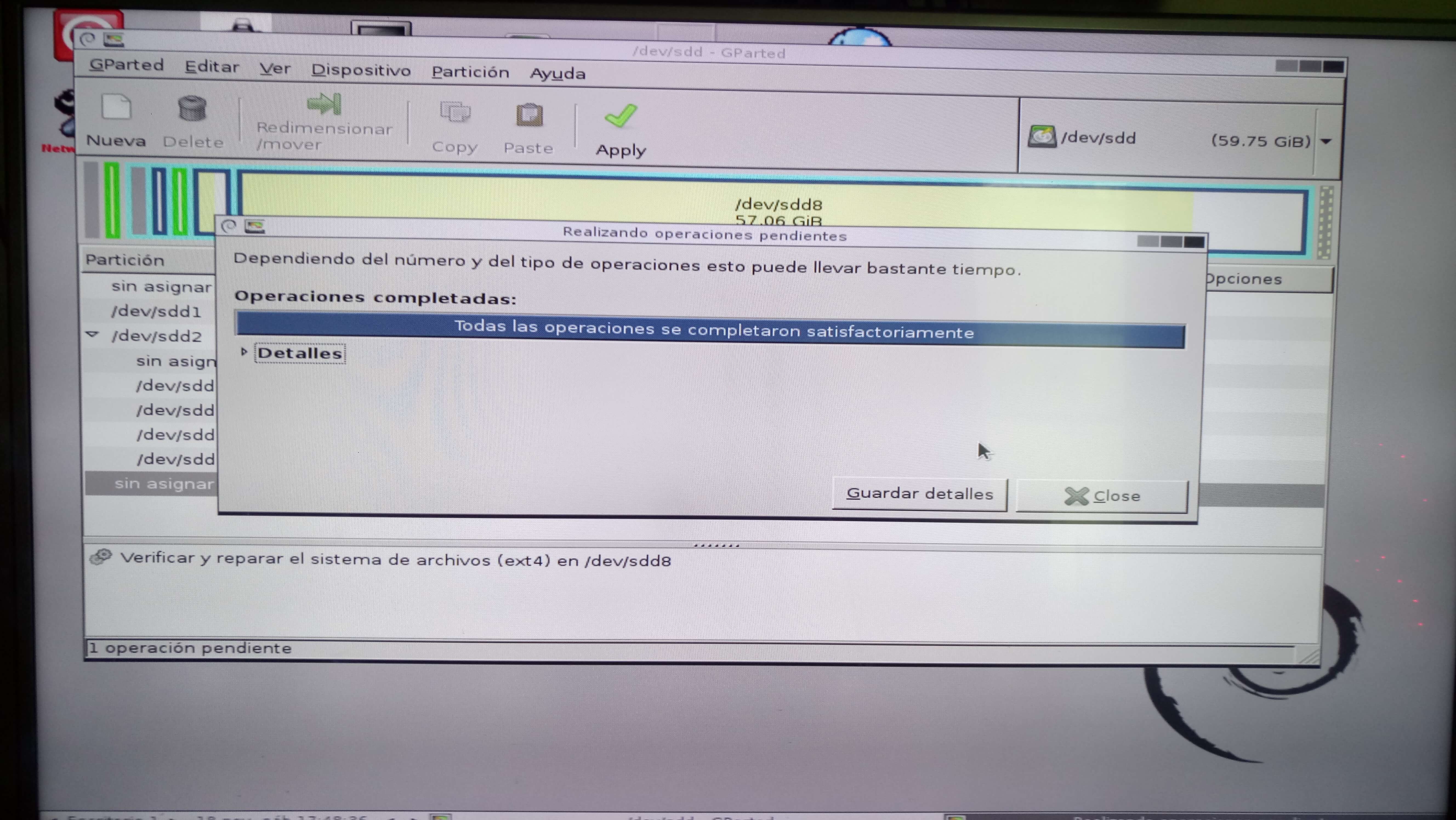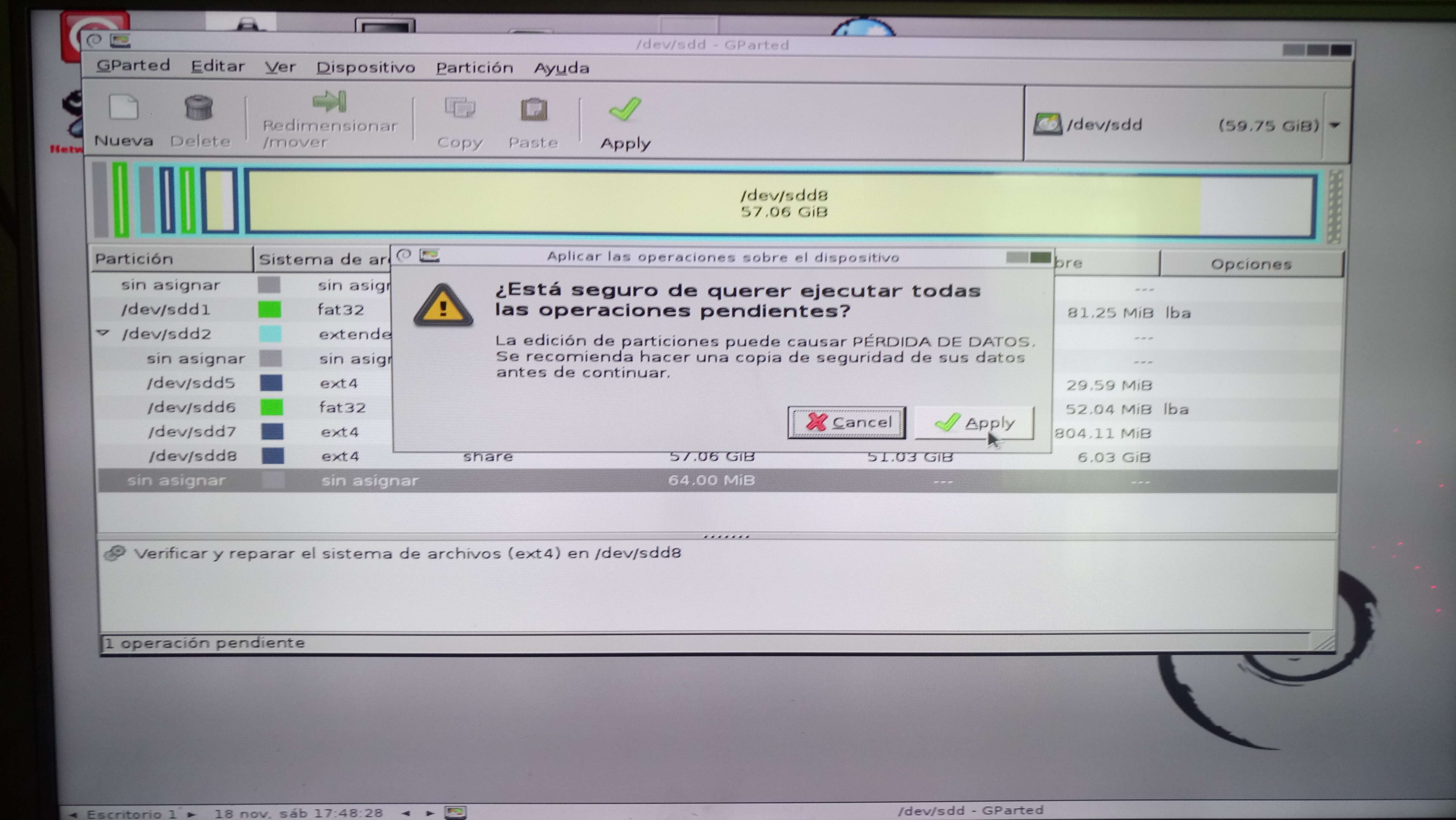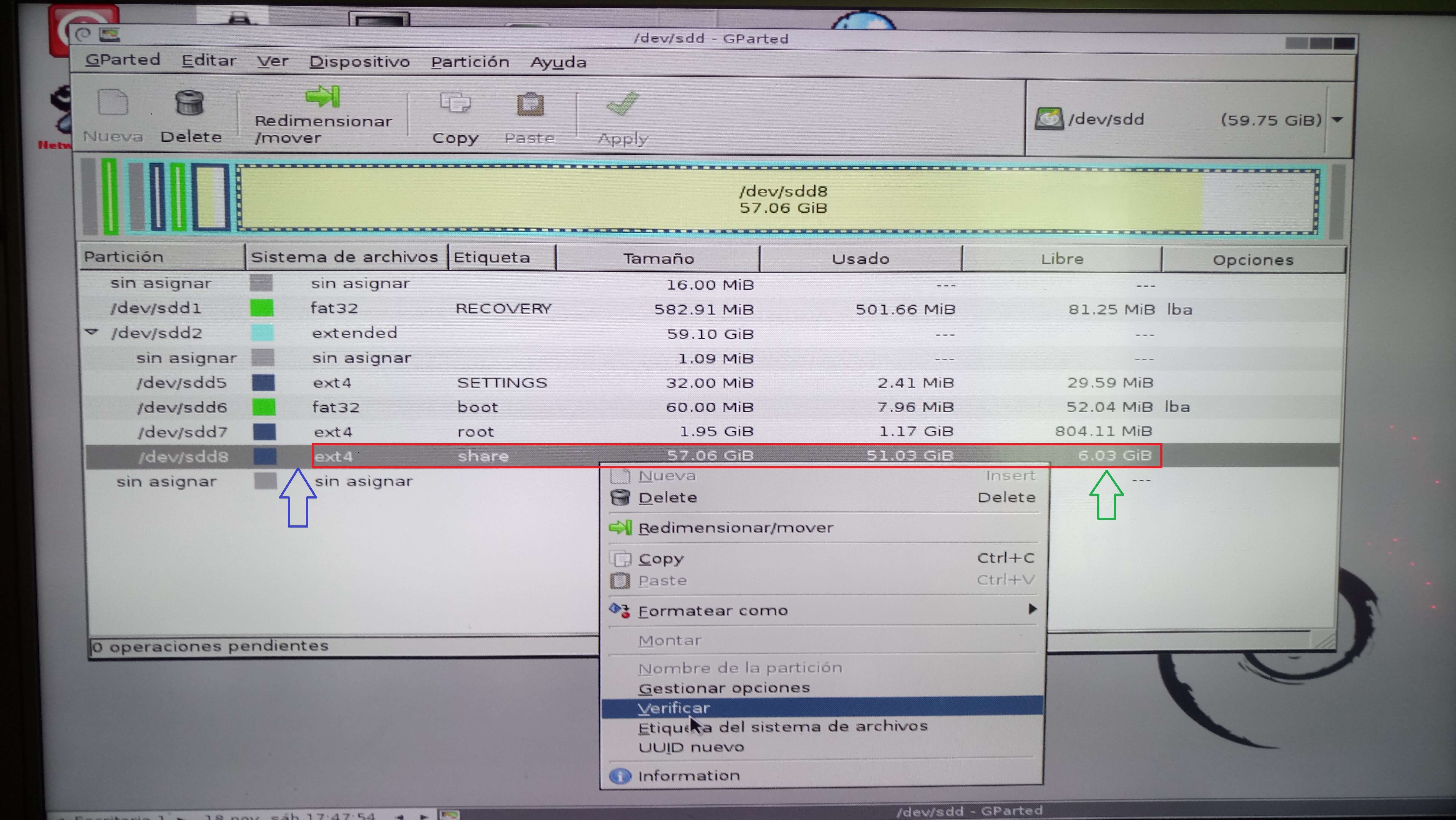 Se les abrirá Gparted, como pueden ver mi MicroSD de 64GB es la que esta seleccionada. Aquí donde tengo marcado con rojo esta la carpeta Share, donde esta apuntando la flecha azul me salia un triangulo amarillo advirtiendo que esta tiene algún tipo error o conflicto, y donde esta la flecha verde solo me reconocía que tenia 1GB disponible, pero después de realizar una verificacion me libero los 6GB que faltaban ( En la imagen ya no me sale el triangulo amarrido porque ya realice el procedimiento ).