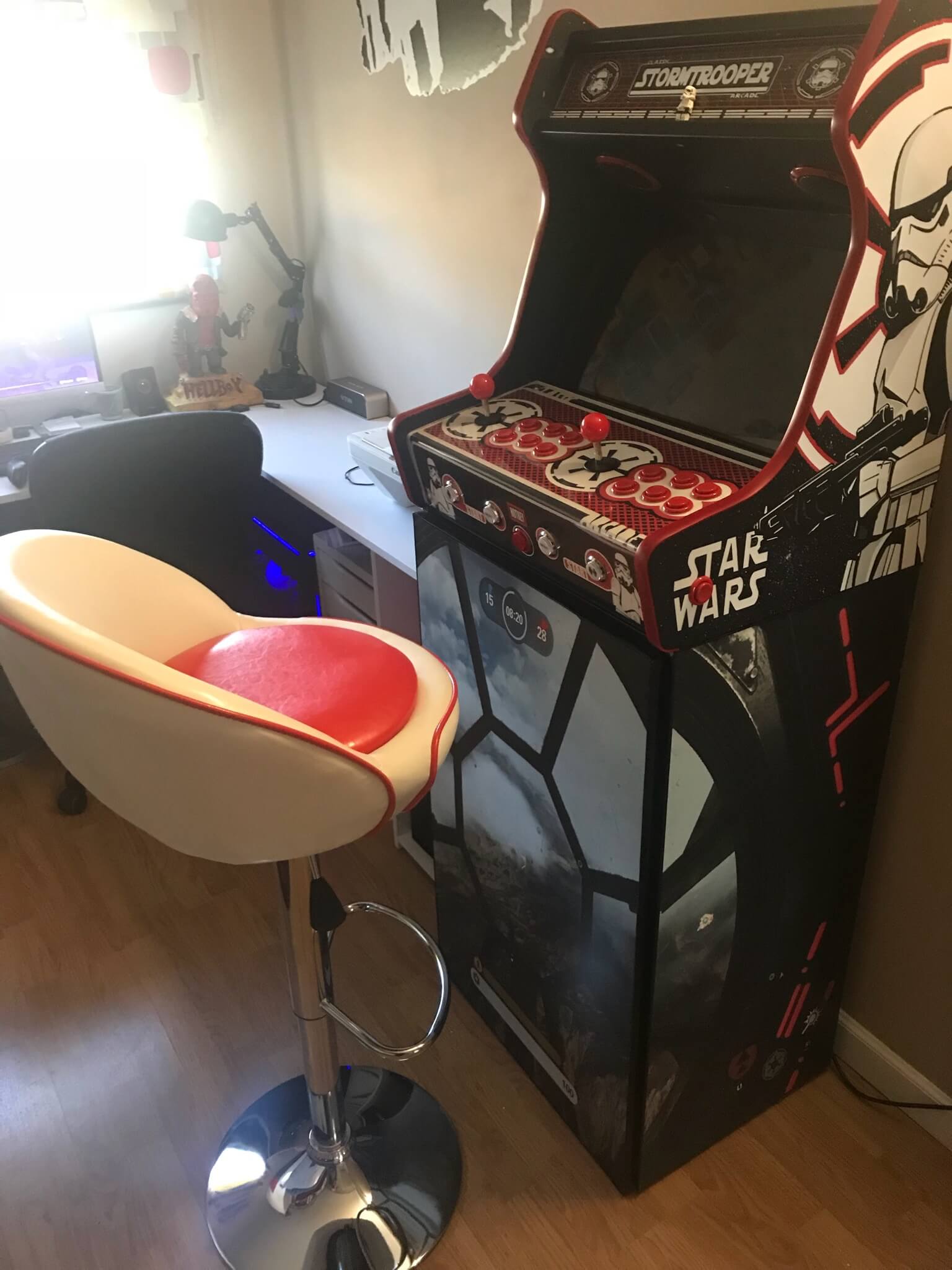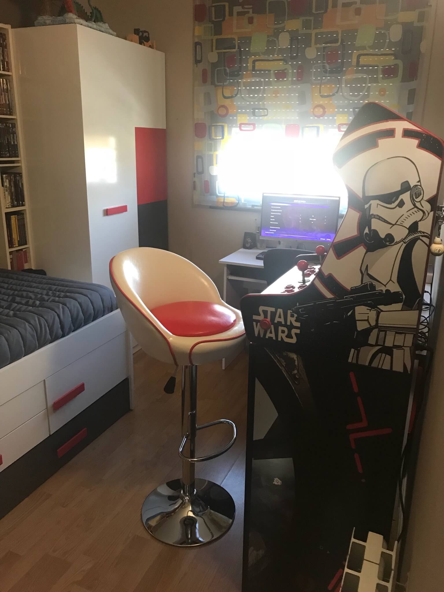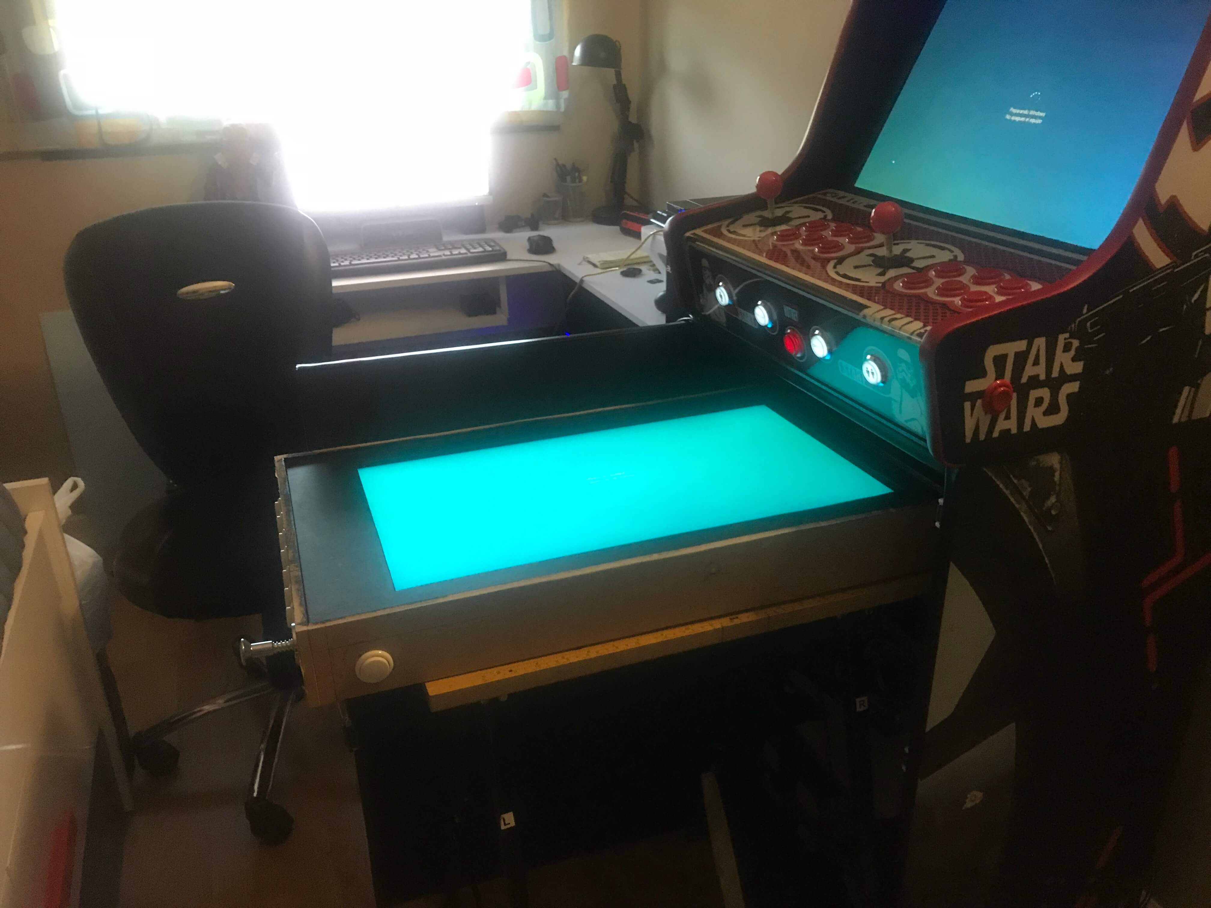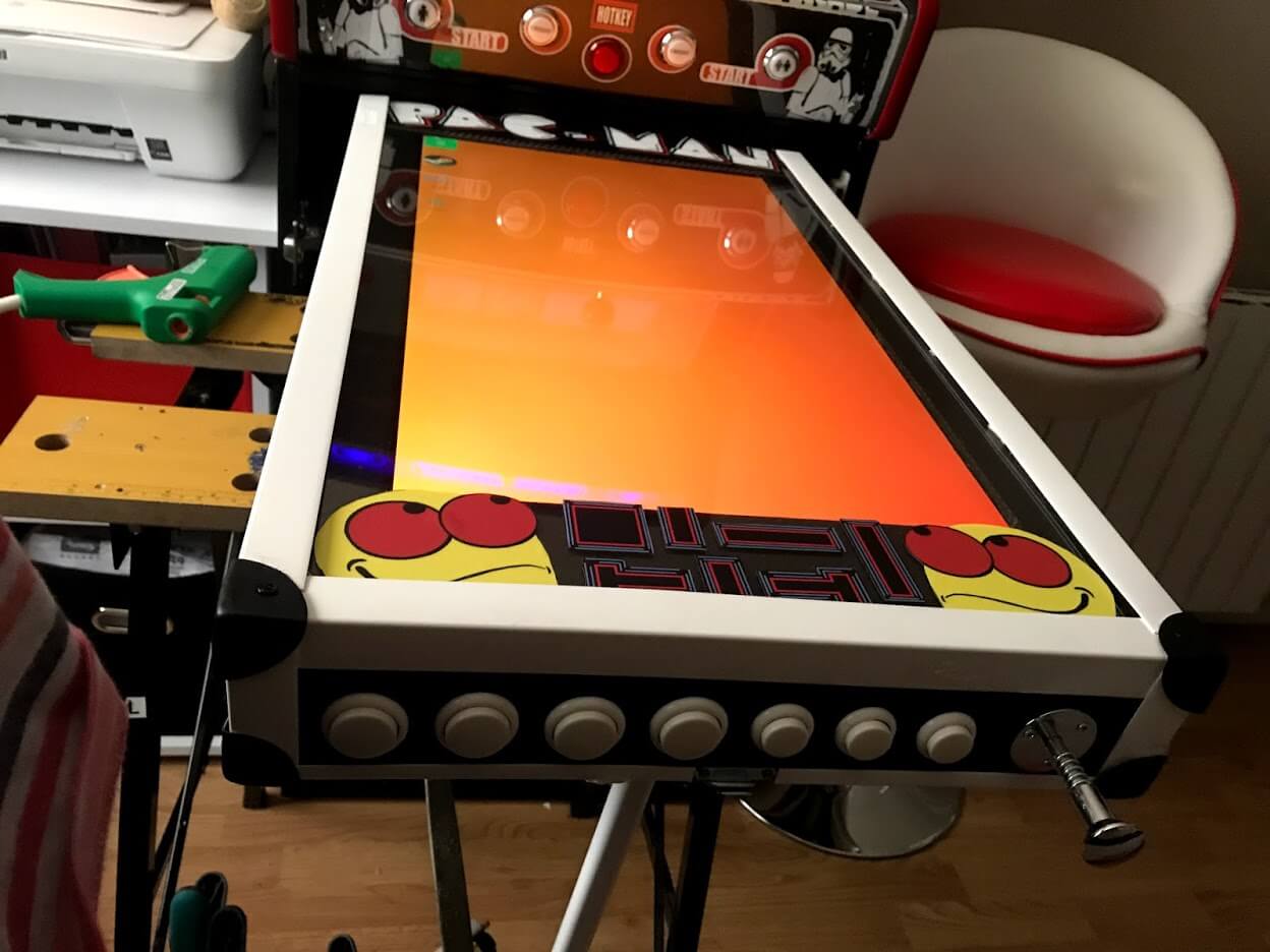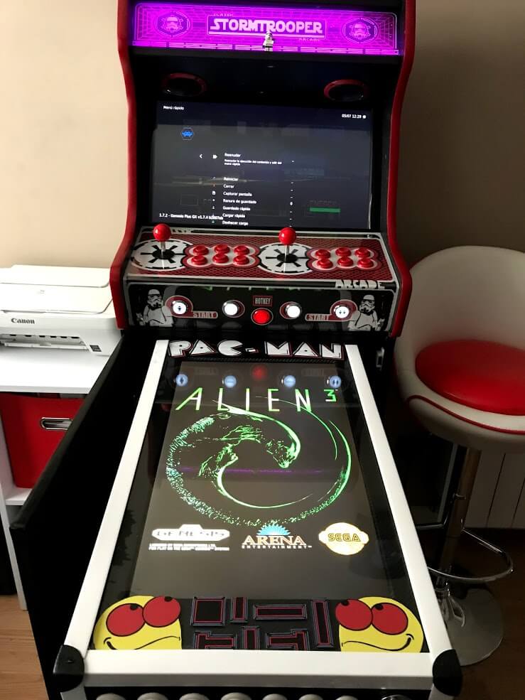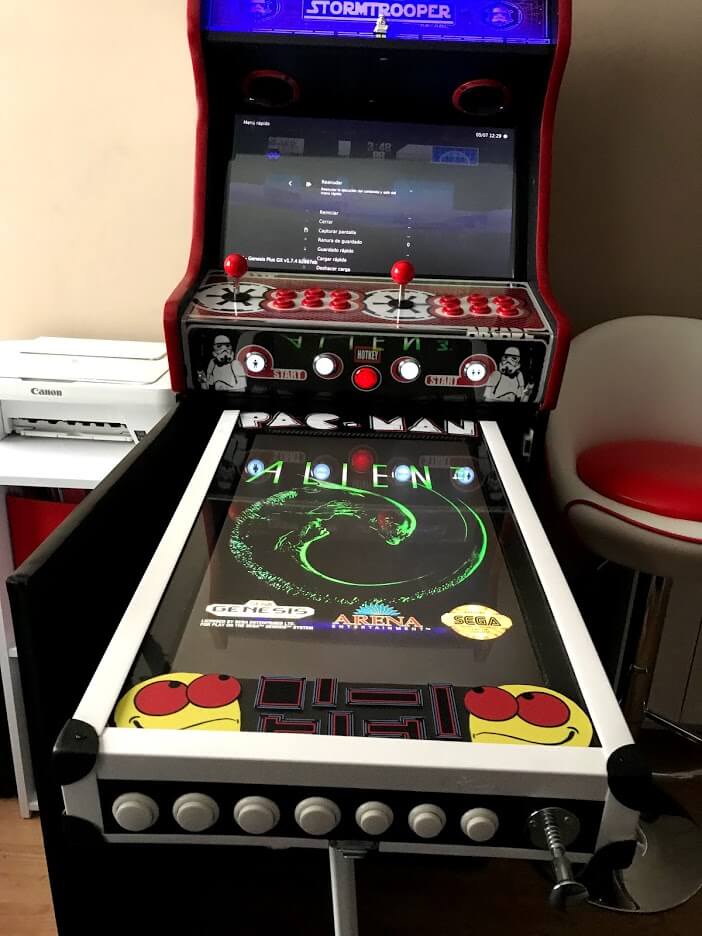 Esta es mi Recreativa,la estoy haciendo yo. Ya la tenía terminada con una Raspberry Pi 3 y una tarjeta de 128gb que daba para muchos juegos, pero me embarcado en la acoplacion de una segunda pantalla para un Pinball y le he sacado la Raspberry y le he puesto un ordenador, como lanzador de consola probé con varios,pero algunos eran muy complicados y otros fallaban bastante. Opte por LaunchBox de pago con licencia de por vida y actualizaciones y es una maravilla, es fácil de usar.