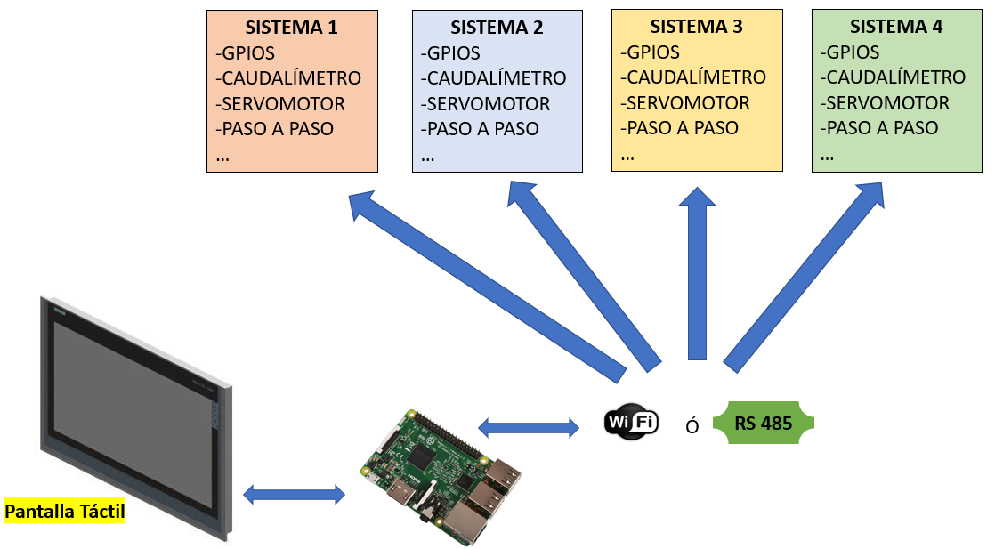 La idea consiste en utilizar Raspberry + pantalla táctil (7" o superior) y a través de ella poder controlar un conjunto de sistemas compuestos cada uno por unos sensores. Habría una pantalla principal en el que aparecerá: sistema 1, sistema 2, sistema 3, etc. y pulsando en cada uno de ellos poder acceder al estado de sus sensores y ver si está activo, o puedo habilitarlo o desabilitarlo, ...)