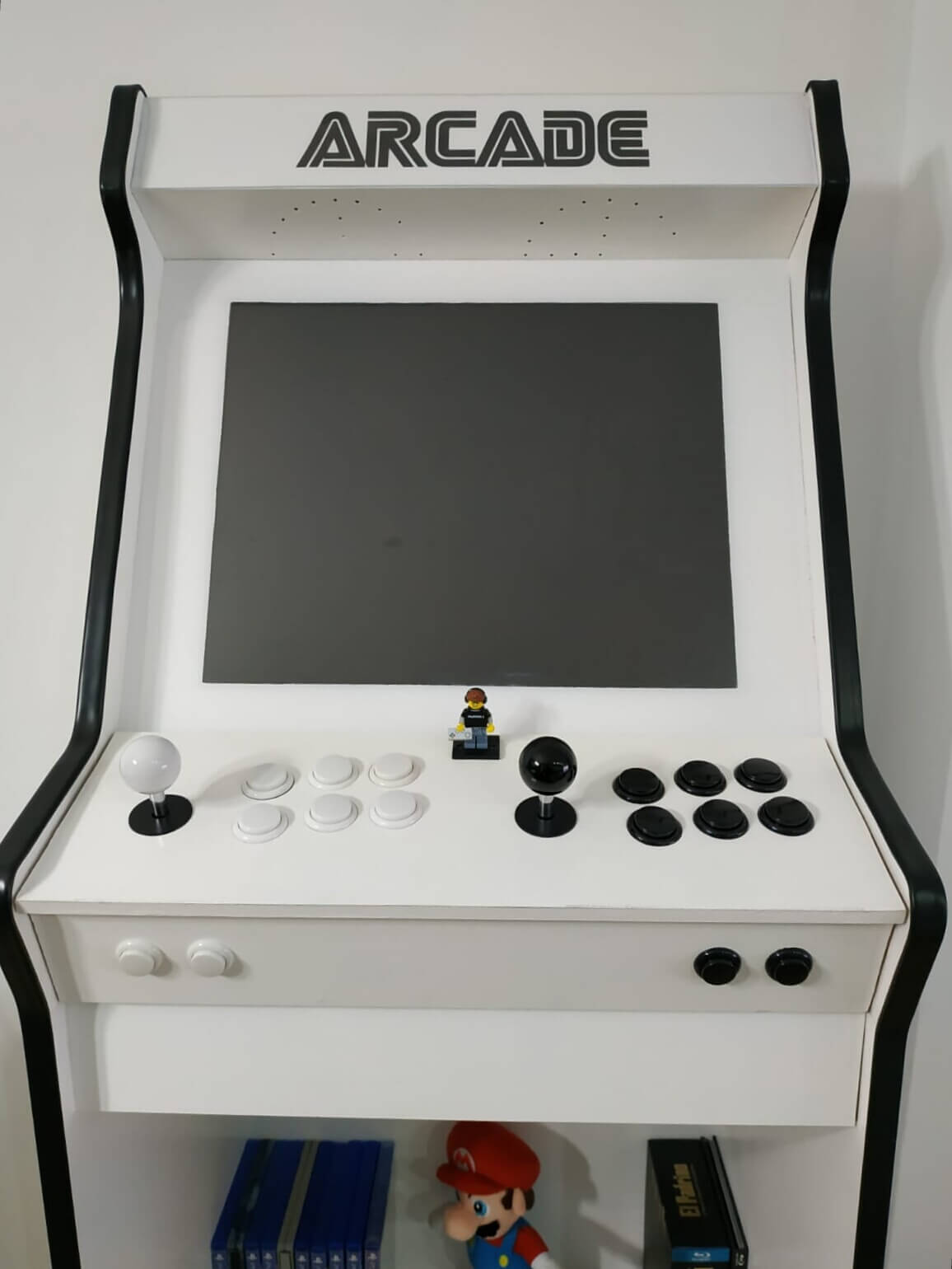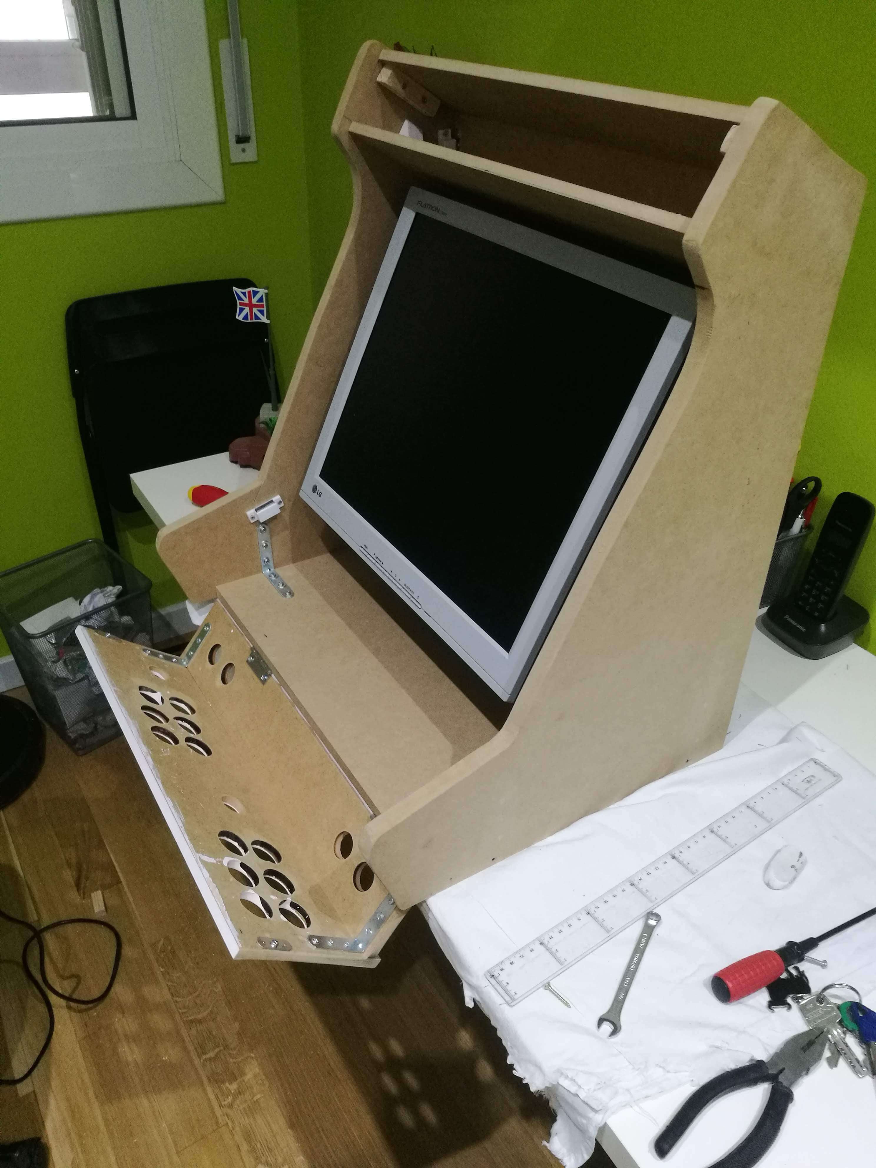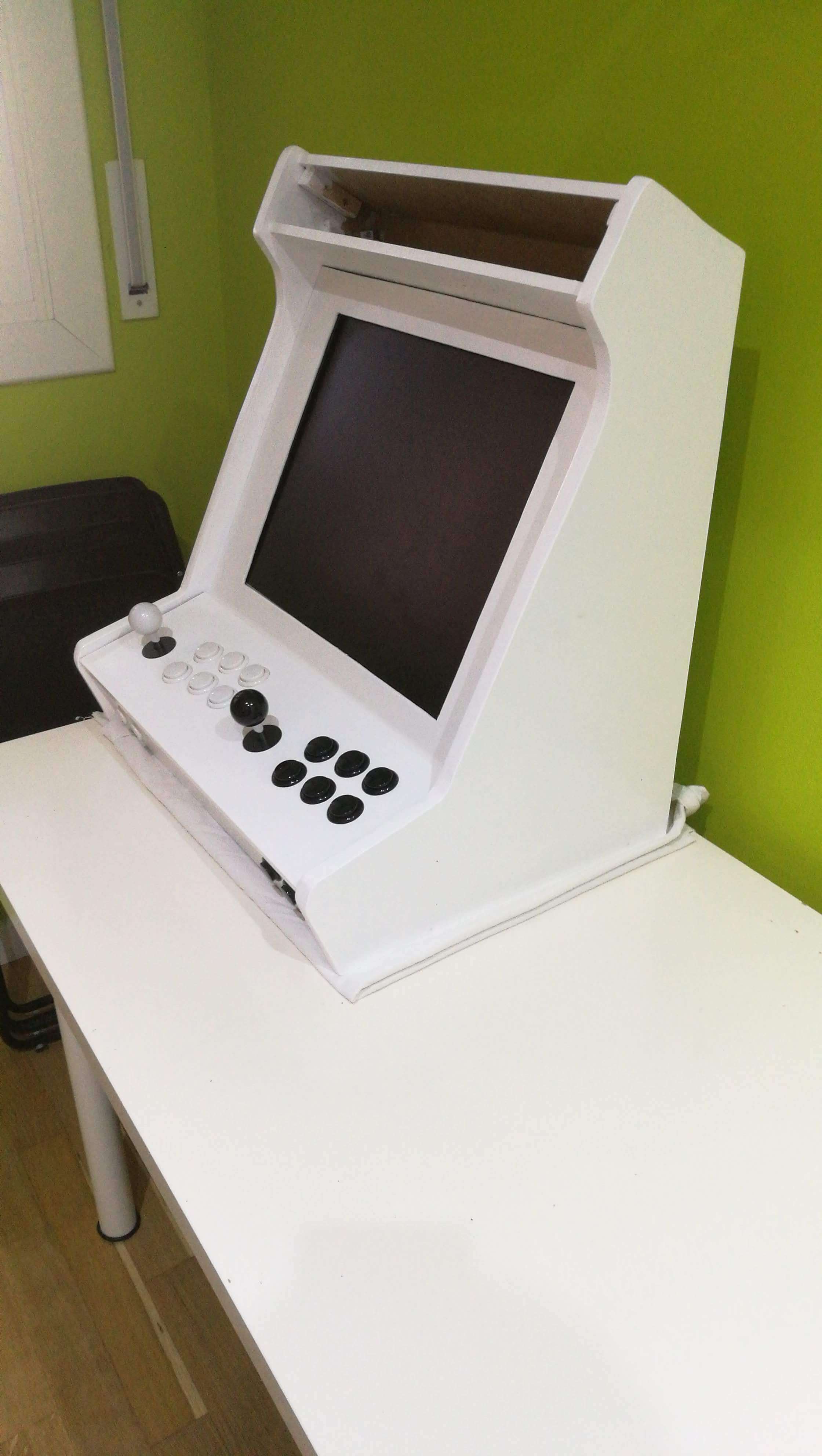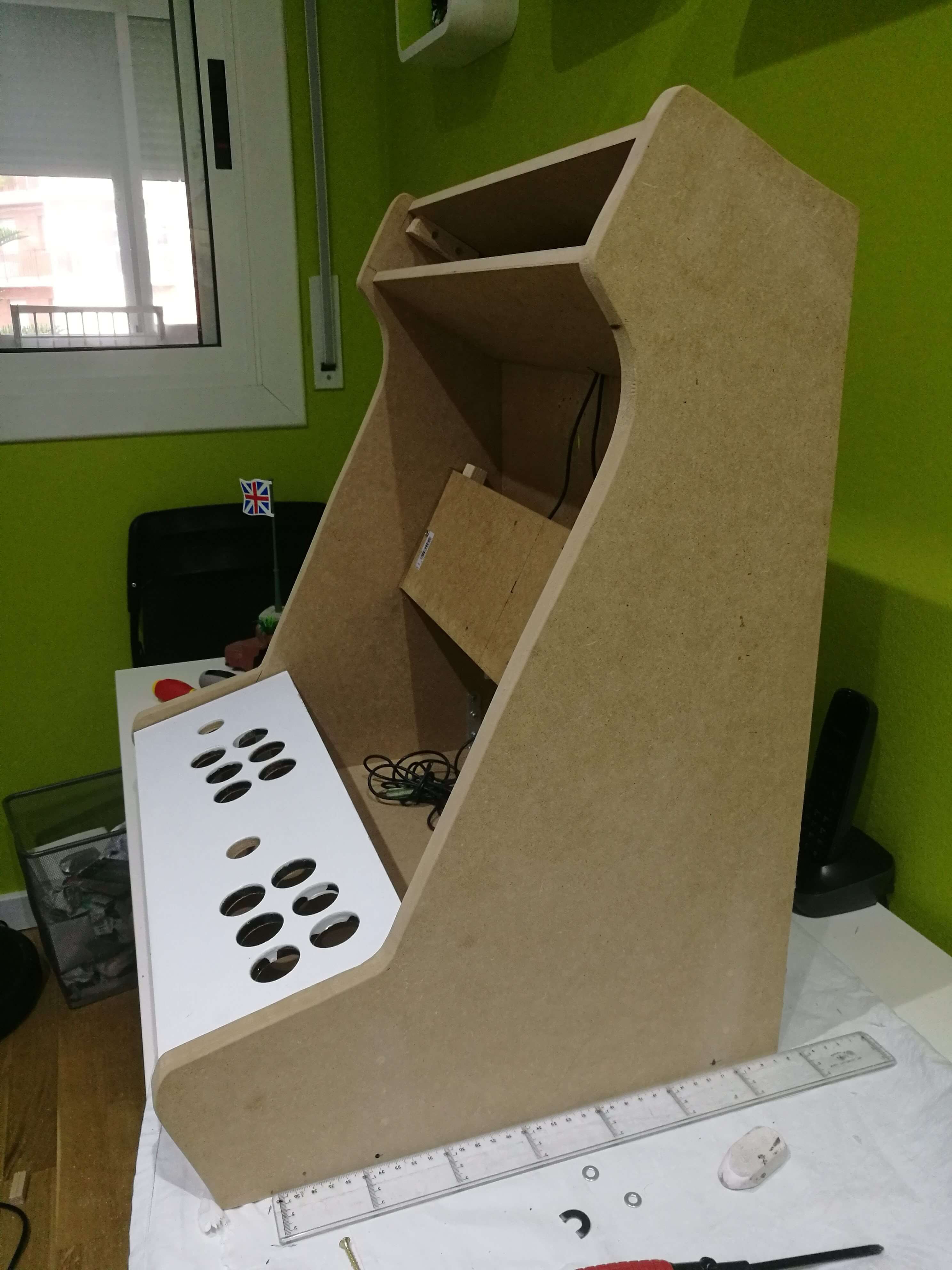 Hola, por aquí os dejo unas imagenes del proceso de construcción de mi bartop casera. Hecha con poco presupuesto, monitor de 19 reutilizado, raspberry pi 3b+, tablas dm de 16mm y 10mm y pintada de blanco brillo.