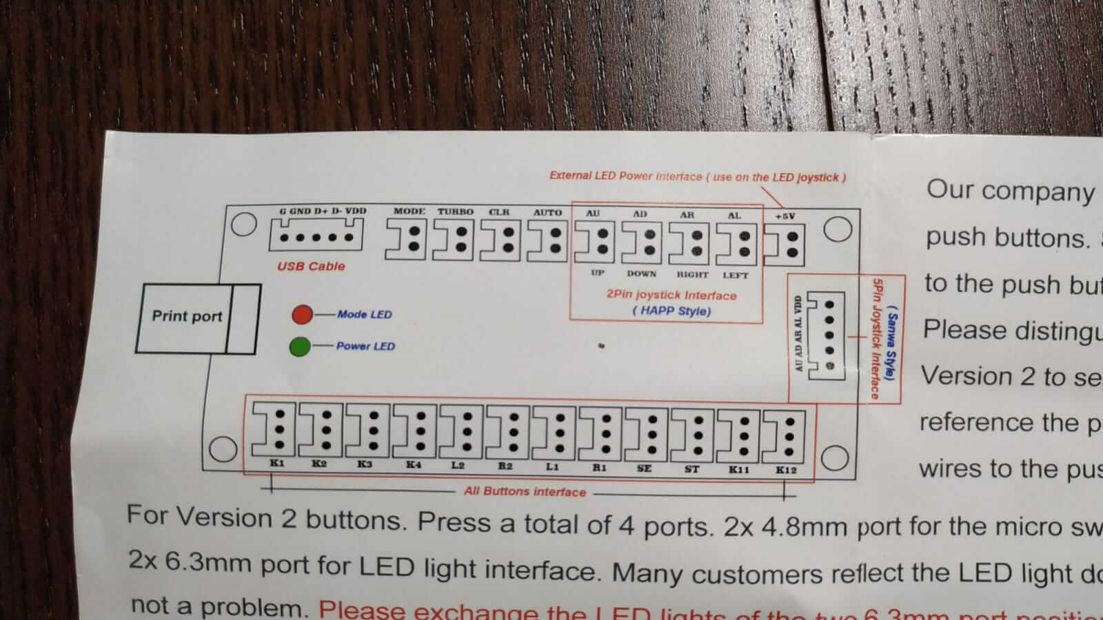 Hola, tengo configurada mi bartop con dos mandos cero Delay. Cada jugador tiene 6 botones y uno para pinball. De los 6 botones 4 están conectados a la placa del K1 al K4, y los otros dos al L1 y R1. Los botones para pinball están conectados a L2 y R2. El player 1 al ST (star) y Coin al SE (select). Un último botón que tengo aparte lo uso para hotkey, conectado a K11.