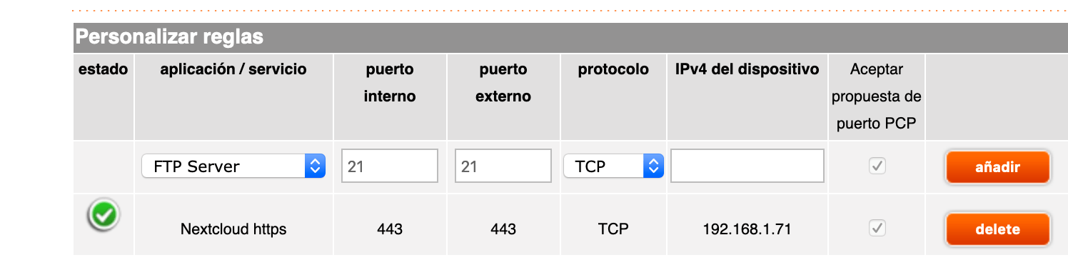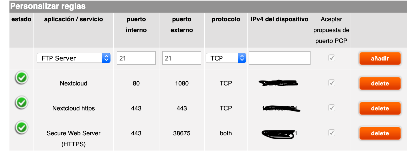 Tienes acceso a Nextcloud por https porque el puerto externo 443 apunta al puerto interno 443, borra la regla 1080 que apunta al 80 y añade otra regla con el puerto externo 80 apuntando al puerto interno 80.danpacu escribió: 21 Feb 2020, 19:21 Hola. Esa regla esta así desde que instalé el nextcloud. No la cambié. La ultima es la nueva. Entonces, la primera puedo borrarla?? La deje tal cual, porque me funciona nextcloud, y pensé que era necesaria para ello...