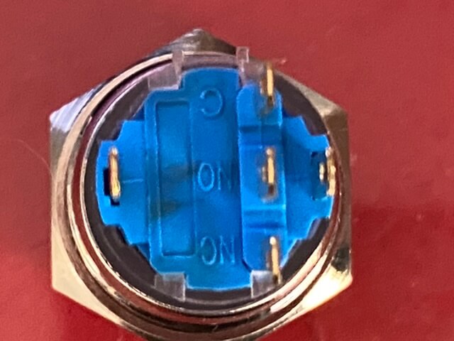 Para el botón tienes que usar el termina NO (normally open) y C (común) el orden en qué lo conectes da igual.