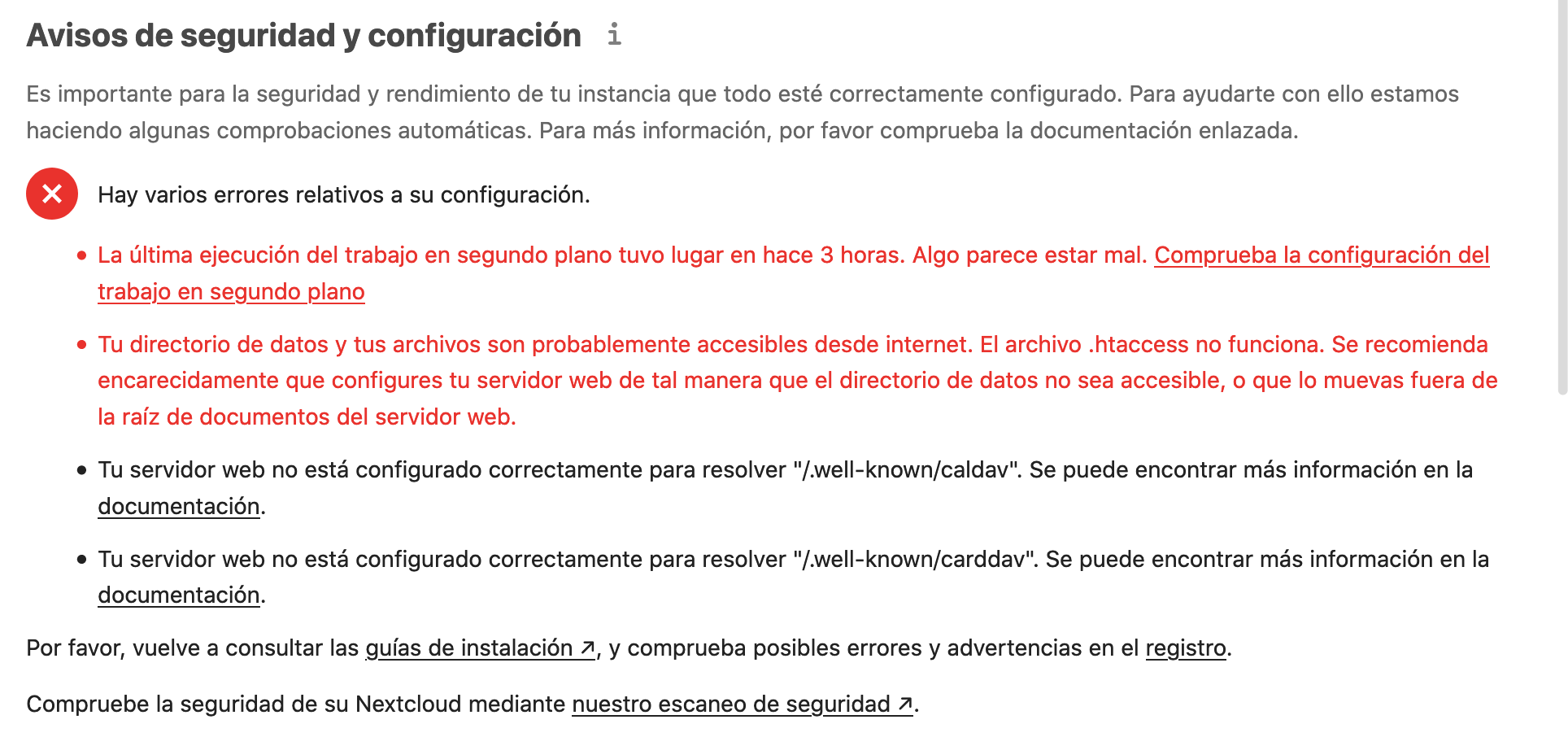 Entramos vía web para comprobar los Avisos de seguridad y configuración. Ya no hay ninguno y hemos configurado correctamente el servidor NextCloud.