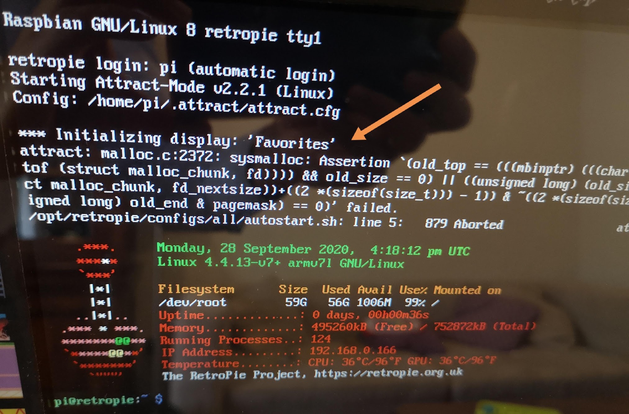 Cuando enciendo la bartop (que siempre salía la intro y después el menu de atract mode) ahora se queda en esta pantalla que adjunto. Parece que algún fichero del arranque está fallando pero no se qué puede ser.