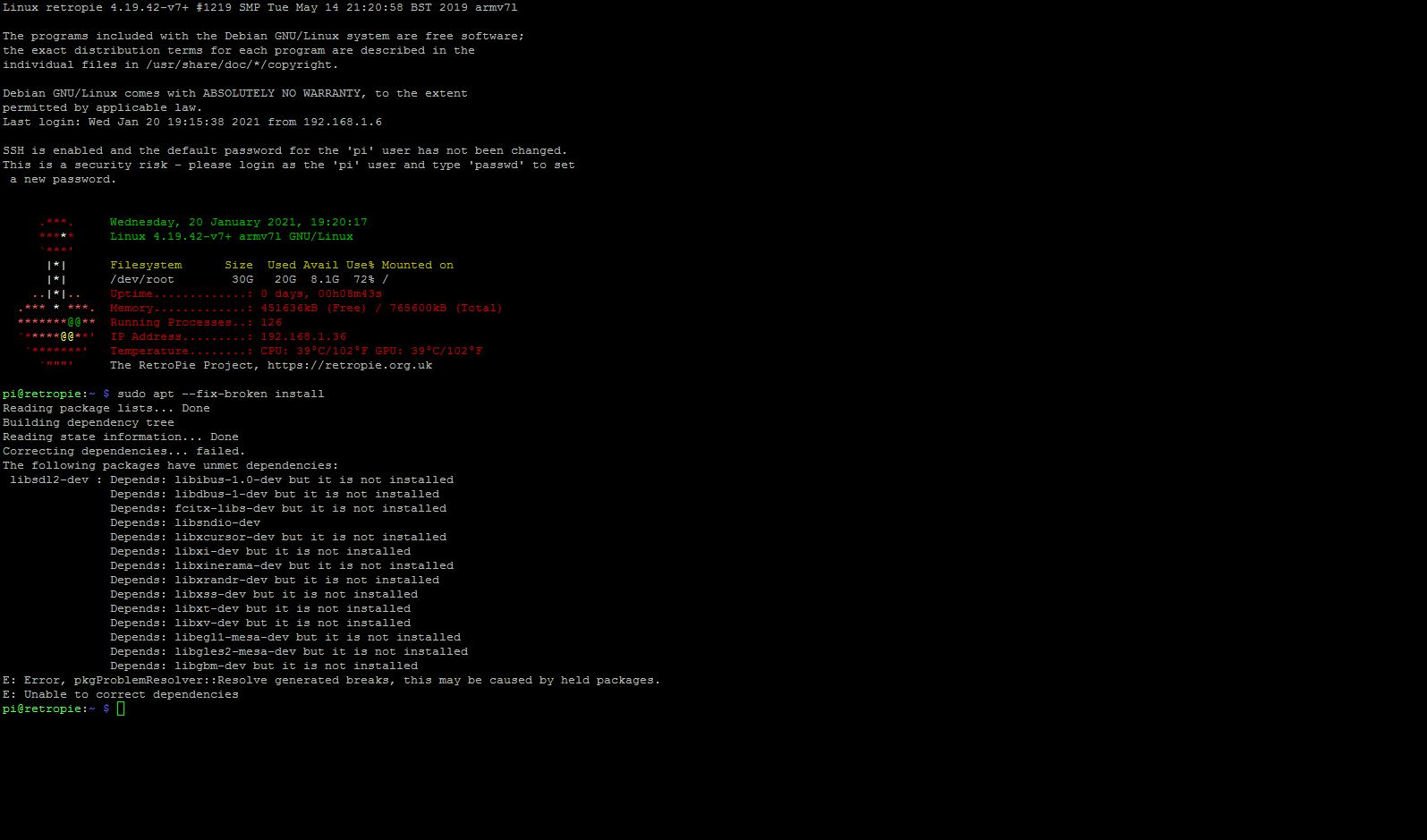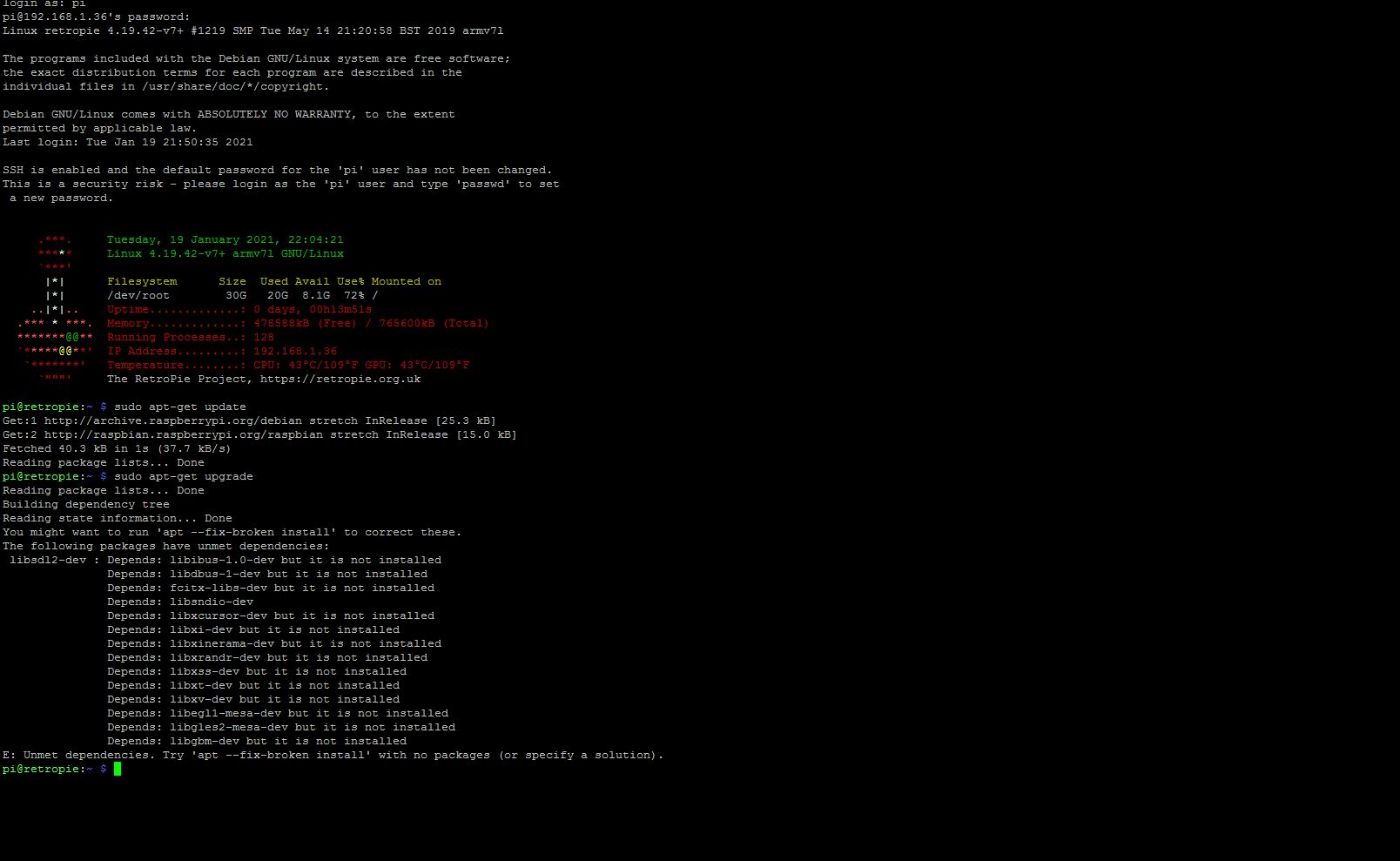 Hoy al entrar en el Menú de retropie --> Retropie Setup "Para instalar un Manege Packages" no soy capaz, he intentado ejecutar cualquiera de las opciones que aparecen en este menú pero siempre con el mismo resultado. Incluso he intentado entrar desde SSH y no hay manera. El resto de Menus "emuladores y ROMS" funcionan sin problemas.