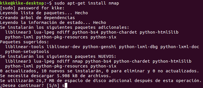 Primero en nuestro Linux instalaremos la herramienta NMAP para escanear, para ello ponemos el siguiente comando en el terminal SSH:
