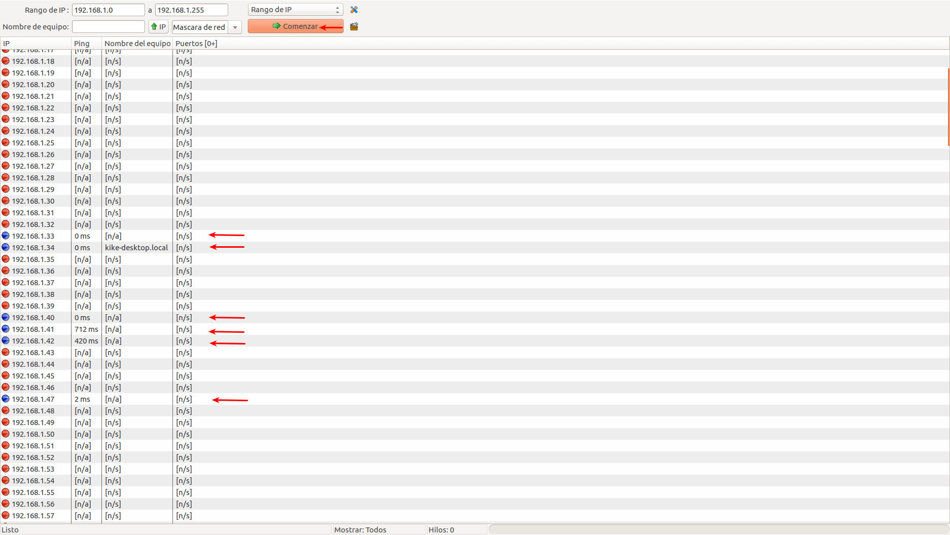 Una vez instalado y ejecutado, veremos lo siguiente: El programa detectará automaticamente nuestro Rango de IP, asi que simplemente debemos pulsar COMENZAR , e irá localizando las direcciones IP que tenemos conectadas en nuestra RED LOCAL