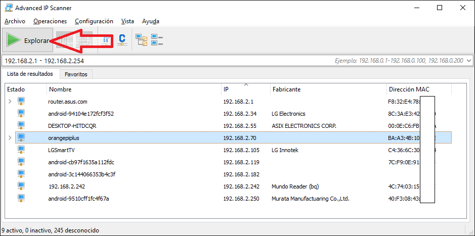 El programa automáticamente detectará el rango de IP de nuestra Red Local, para ello simplemente debemos pulsar en el botón "EXPLORAR" y escaneará todos los equipos conectados a nuestra Red Local, entre ellos estará nuestra Pi.