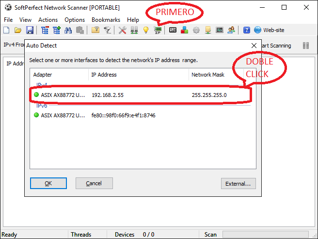Cuando lo tengamos ejecutado (Al ser version portable, previamente es necesario descomprimir) hay que darle al botón que marco en la imagen (Auto Detect IP Range), para que detecte automaticamente nuestro Rango de IP Local: