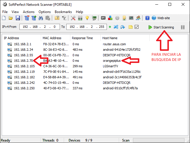 Y por ultimo damos click en "Start Scanning" y nos aparecerá en el listado la IP de Red Local, que tiene asignada nuestra Pi.