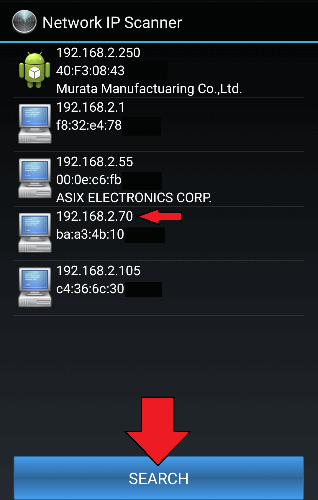 Una vez iniciado, pulsamos el botón "Search" ubicado en la parte inferior para comenzar a buscar, con eso ya tendremos localizado la IP de nuestra Pi