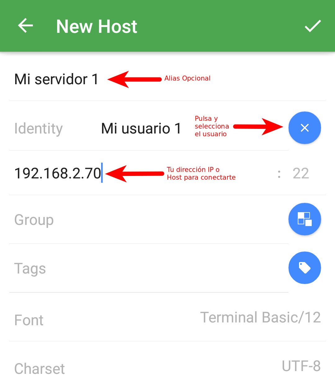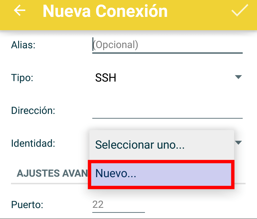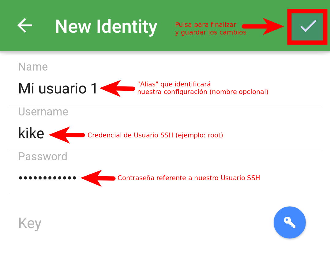 Damos a Conexiones Creamos primero un nuevo usuario en Identidad - Nuevo Agregamos el usuario SSH y establecemos la contraseña Ahora introducimos todos los datos correspondientes indicados en la imágen Y para conectar, pulsamos en el Host Creado!
