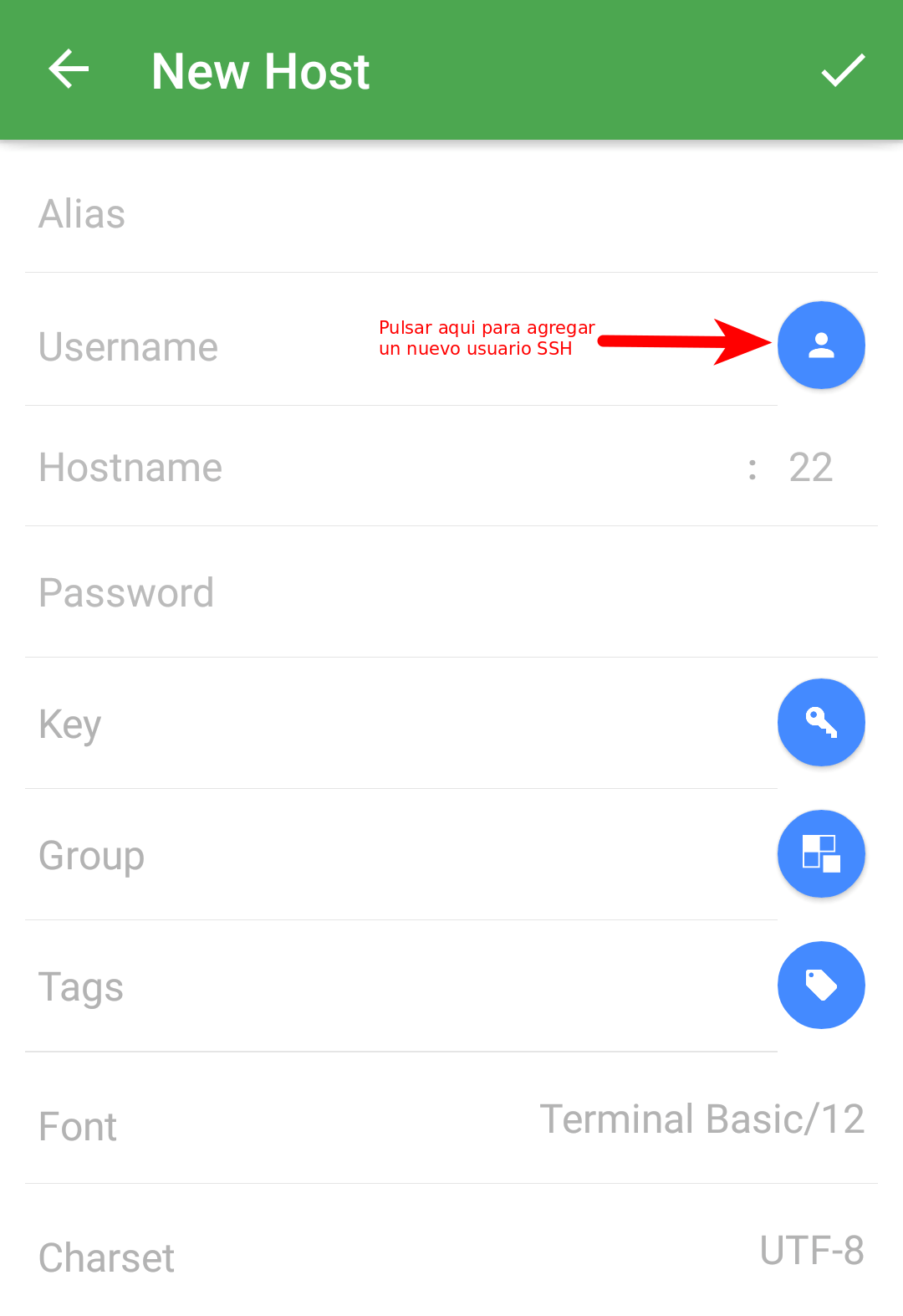 Primero pulsamos en el simbolo ( + ) En la parte inferior derecha y seleccionamos "New Host" Pulsamos en el símbolo de Username para agregar. Pulsamos en el símbolo ( + ) : Rellenamos los datos correspondientes explicados en la imagen: Una vez guardados los cambios, volvemos a introducir los datos correspondientes para conectar: Una vez guardados los cambios, simplemente pulsamos en la barra para conectar!