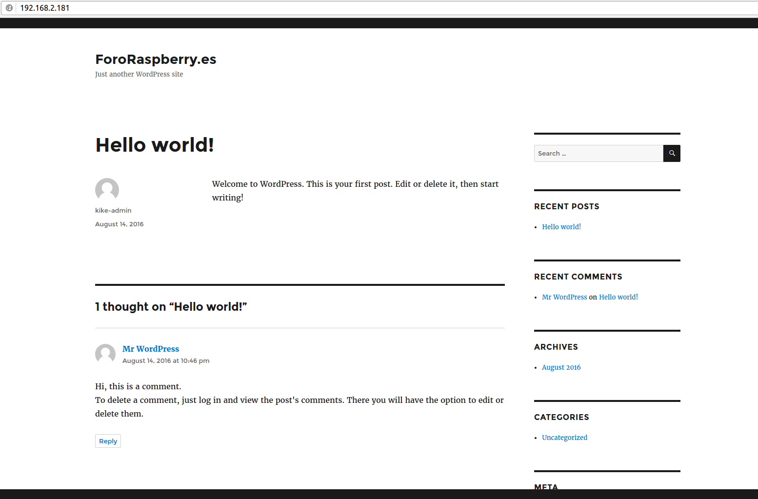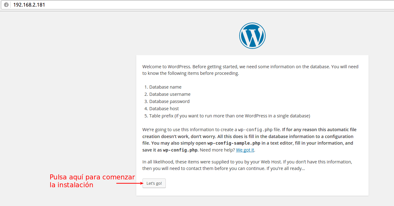 Si hemos llegado hasta aquí siguiendo todas las pautas correctamente, ahora simplemente debemos acceder a nuestro sitio Wordpress introduciendo nuestra IP de red de nuestra Placa Pi en el navegador Web: