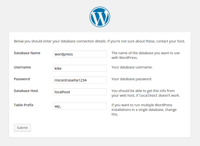 Una vez todo introducido , daremos al botón "Submit" en la parte inferior, e iremos al siguiente panel.Table Prefix : wp_