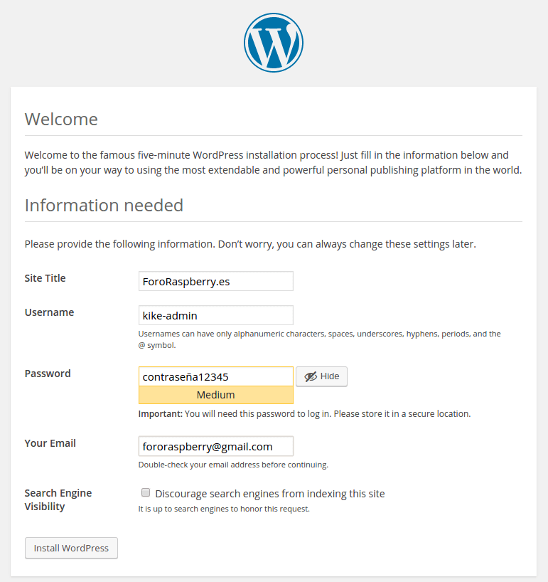 Y para finalizar pulsaremos "Install Wordpress" en la parte inferior del formulario.Email: fororaspberry@gmail.com