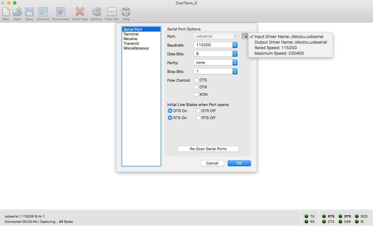 Conectamos el USB al ordenador y abrimos Coolterm. Si todo va bien, nos detectará que esta operativo el usb serial. Para ver esto pinchamos en Options y dentro de Serial Port Options, desplegamos las opciones de Port para seleccionar el USB Serial.