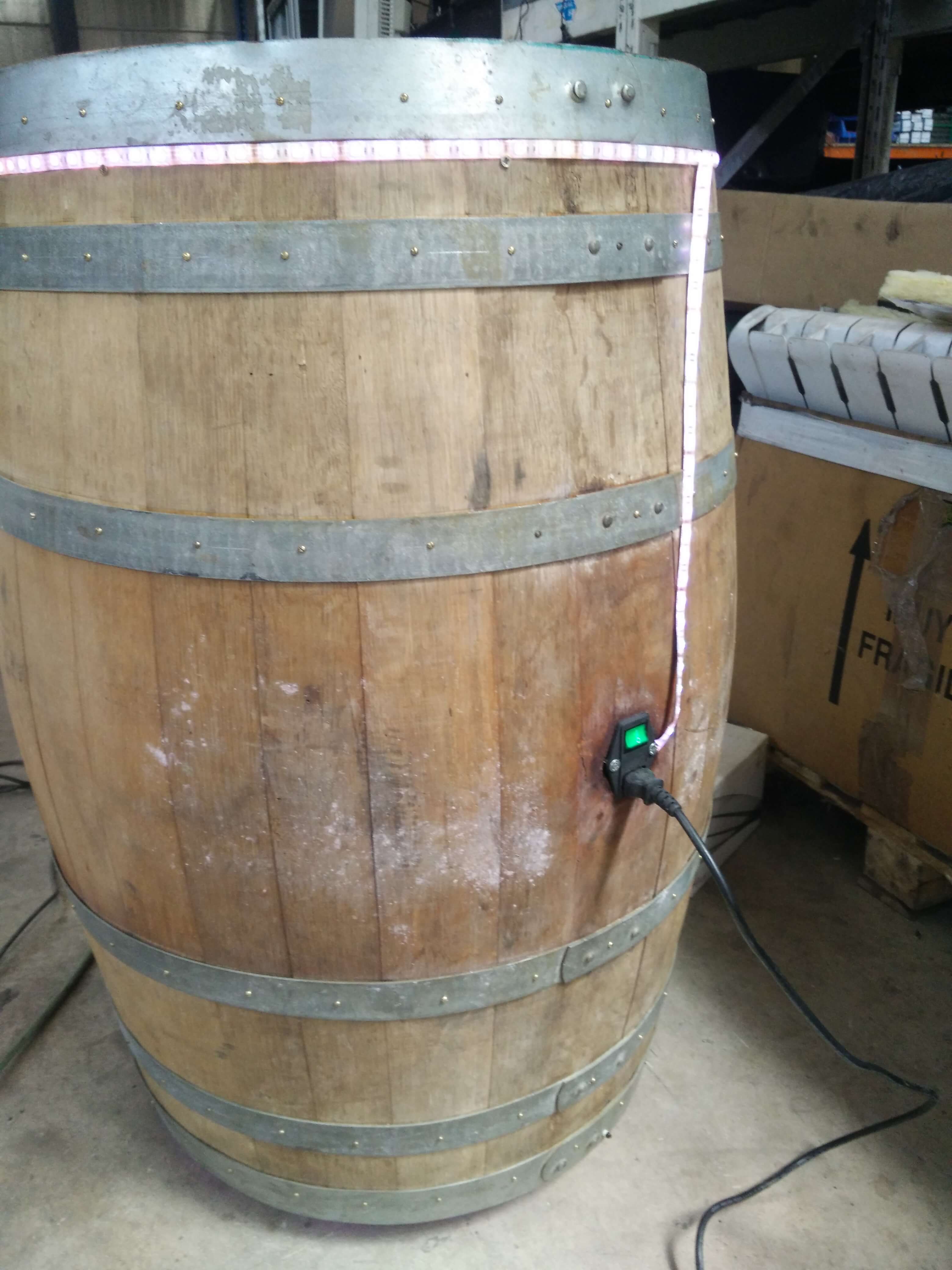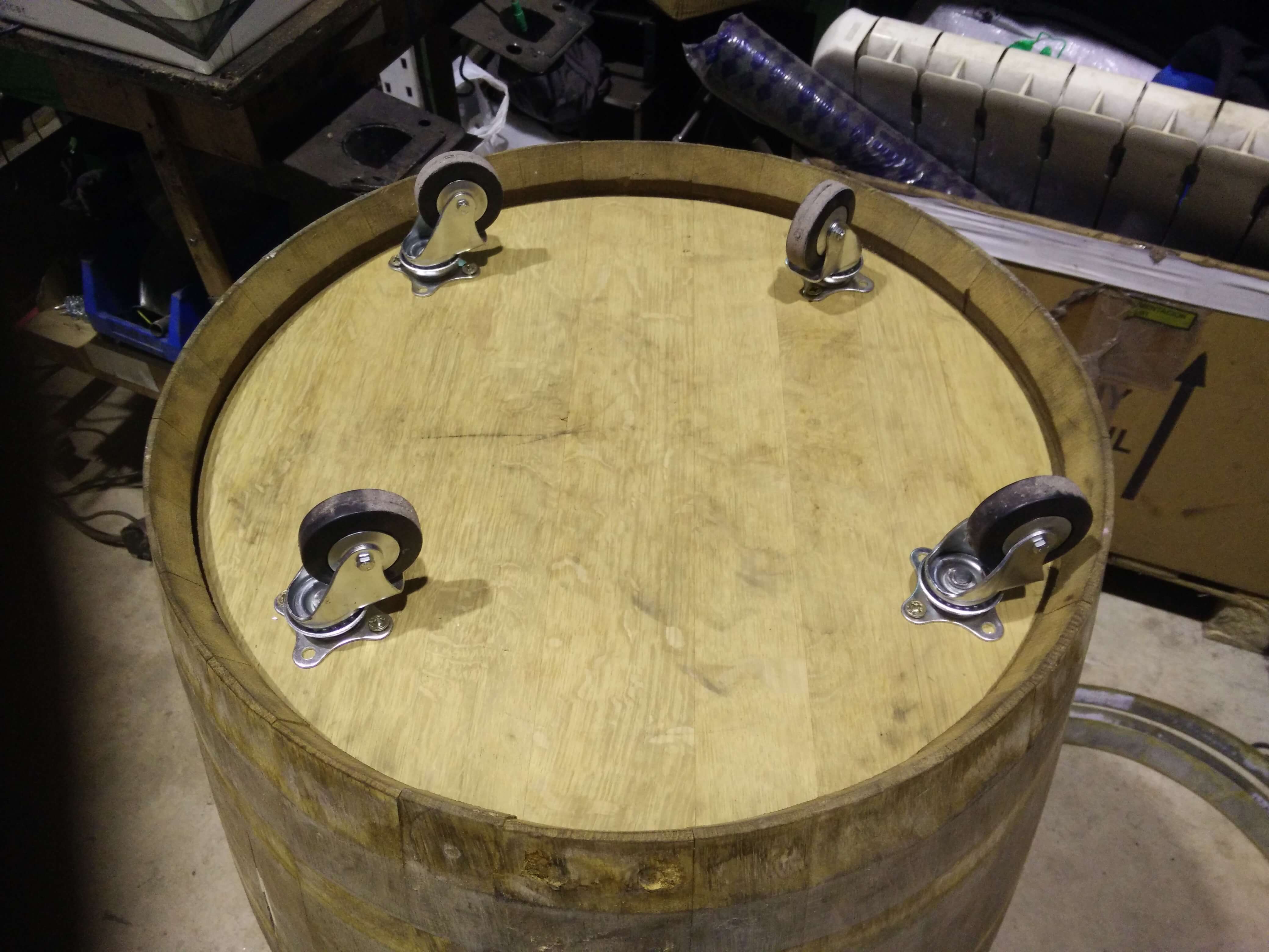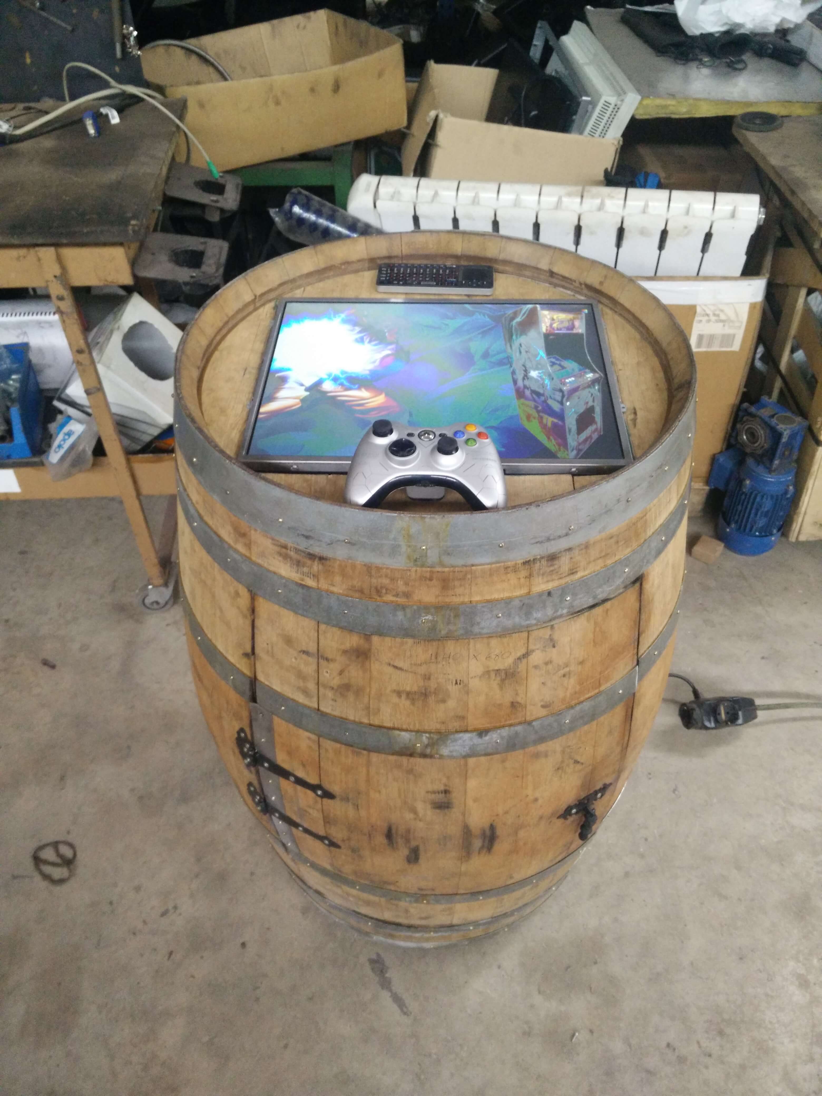 Un barril transformado en mesa y maquina retro con una raspberry pi mas botellero para echarte uno vinillos entre partida y partida