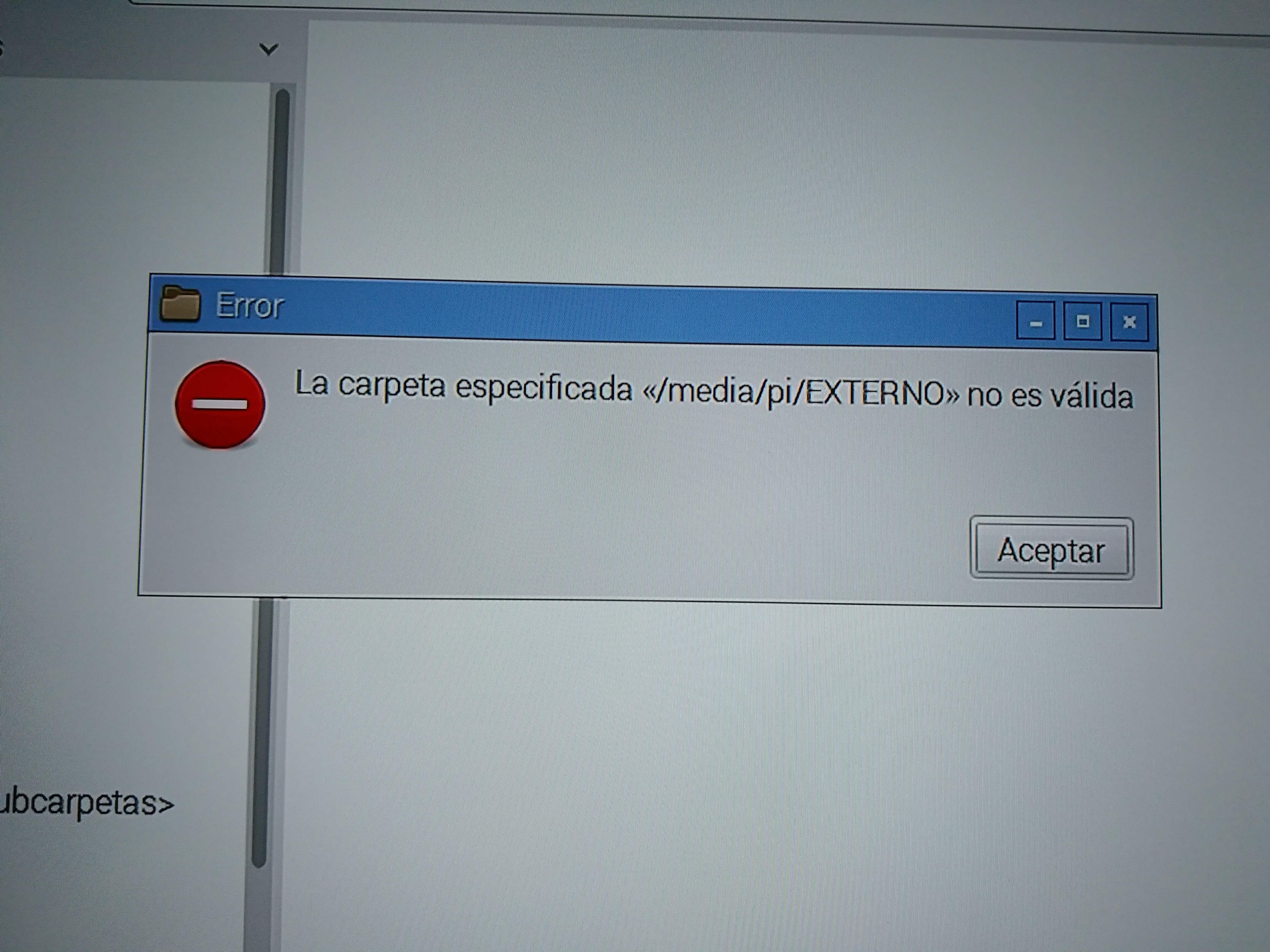 La carpeta especificada "/media/pi/EXTERNO" no es válida.