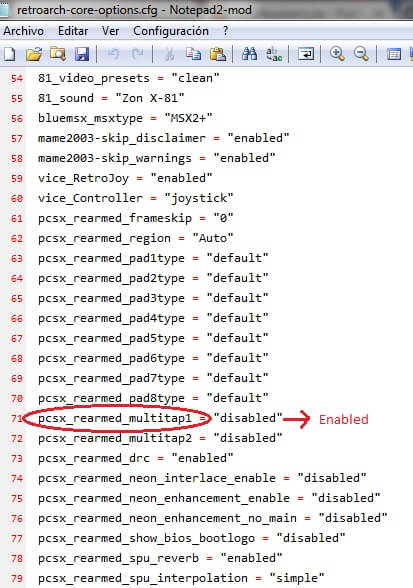 Buenas a tod@s, me estoy volviendo loco para intentar jugar a 4 players en la psx (en plan como si fuese multitap), he probado una cosa que he visto en un video, pero al modificar no puedo entrar al juego. A continuación pongo el video y mi configuración en el archivo "retroarch-core-options.cfg". La localización donde se encuentra es la siguiente: share/system/configs/retroarch/cores/retroarch-core-options.cfg